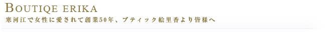 ブティック絵里香は寒河江市の中心市街地に営む、女性のファッション選びをお手伝いするお店です。流行に敏感な東京からブランド服をいち早くお客様のお手元へ。街の女性が美しく輝ける事を願い、流行を先取りできることをモットーにお客様にご提供しております。